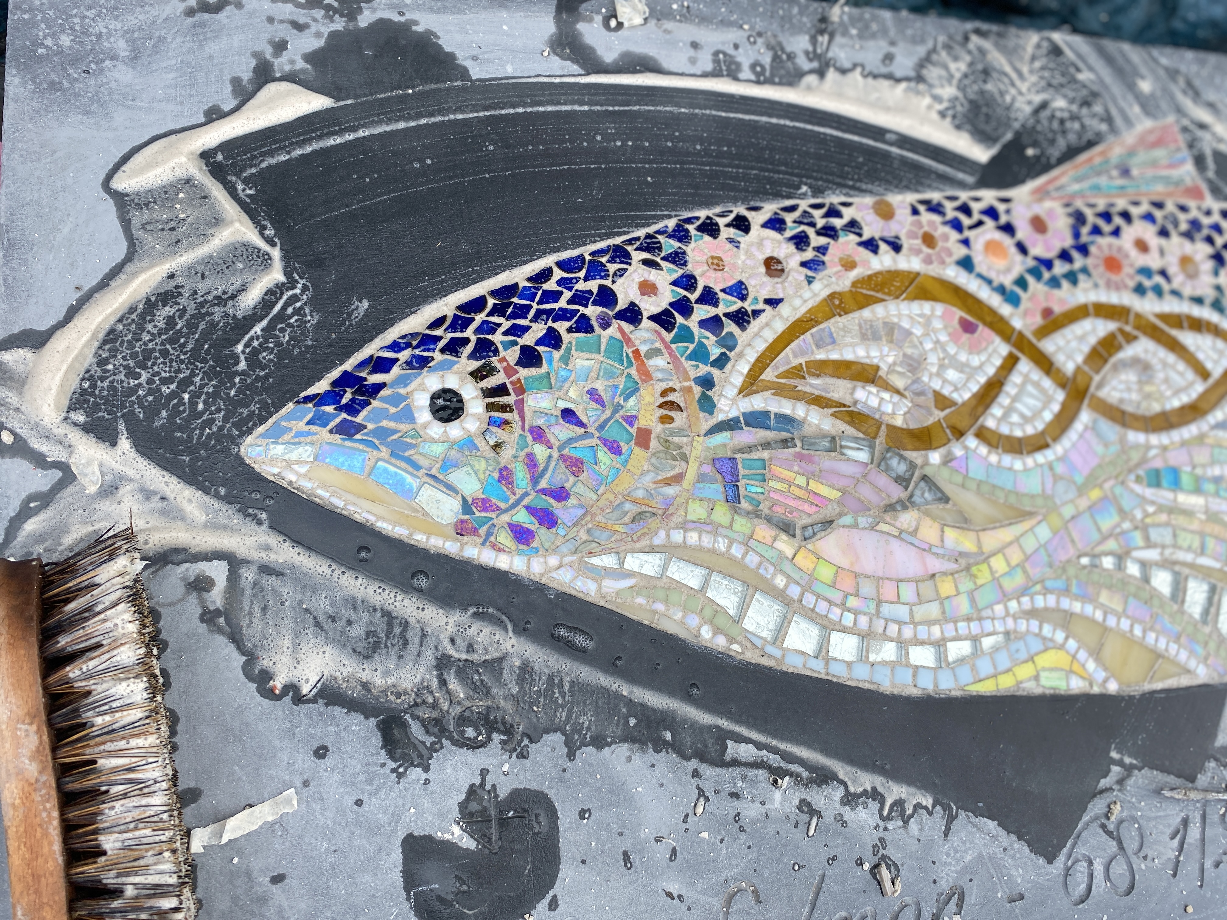 'The Biggest Fish’ was created by mosaic artist Stephanie Roberts and the pupils of year 6, Usk C V Primary School 2024-25.