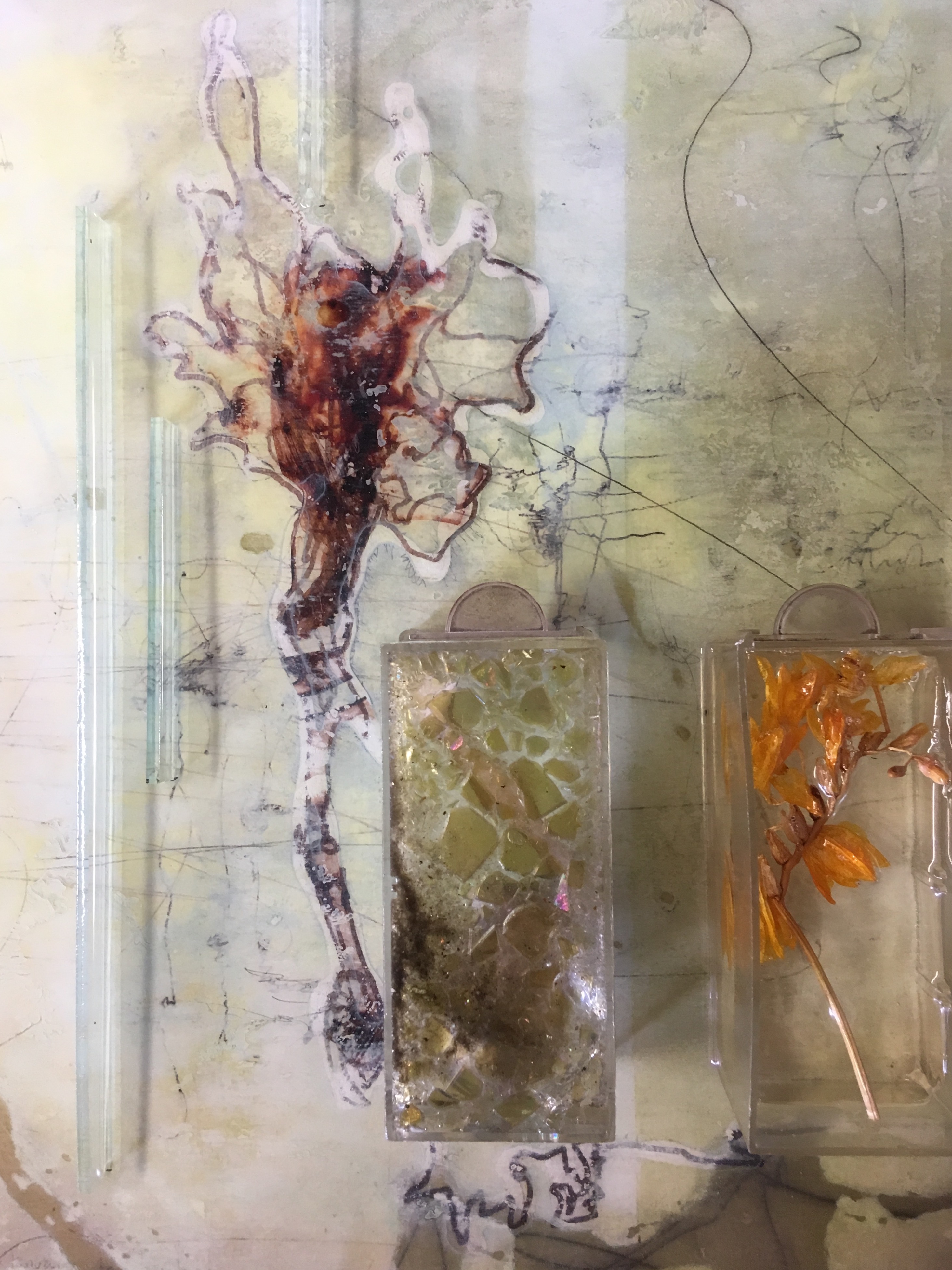 Mosaic art forumlas are still feeding my thought processes toward making. However, combining a multiple of tecniques and making processes have opened opportunities to explore painting, assemblage and installation art. Therefore beinging to release the tesserae from the confinements of the cement.